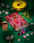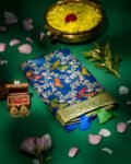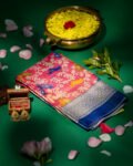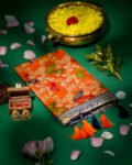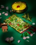 Banarasi Saree made from premium fabric, showcasing a Jal Pattern with bird print design spread across the body and enhanced with a golden ivory zari border.