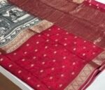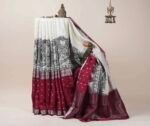 Celebrate timeless artistry with this exquisite ivory and crimson silk saree, a perfect blend of tradition and elegance. Crafted from premium-quality silk, this saree features a rich off-white body adorned with intricate black illustrative motifs inspired by heritage temple art and folklore scenes.