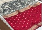 The deep crimson border and pallu add a striking contrast, highlighted with delicate woven patterns and subtle zari accents that enhance its regal charm. The lower half showcases elegant polka dot motifs, creating a harmonious balance between classic and contemporary design elements.